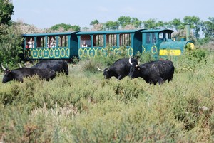 Le petit train du Domaine de Méjanes vous fera découvrir toute la diversité des paysages de Camargue grâce à un circuit pittoresque sur les bords de l'étang du Vaccarès. Le petit train sillonne le domaine et effectue une boucle de 3.5 km durant 25 minutes environ. A bord du train, vous observerez la faune et la flore sauvages locales : taureaux, chevaux, canards, hérons, passereaux, busards, flamants roses...